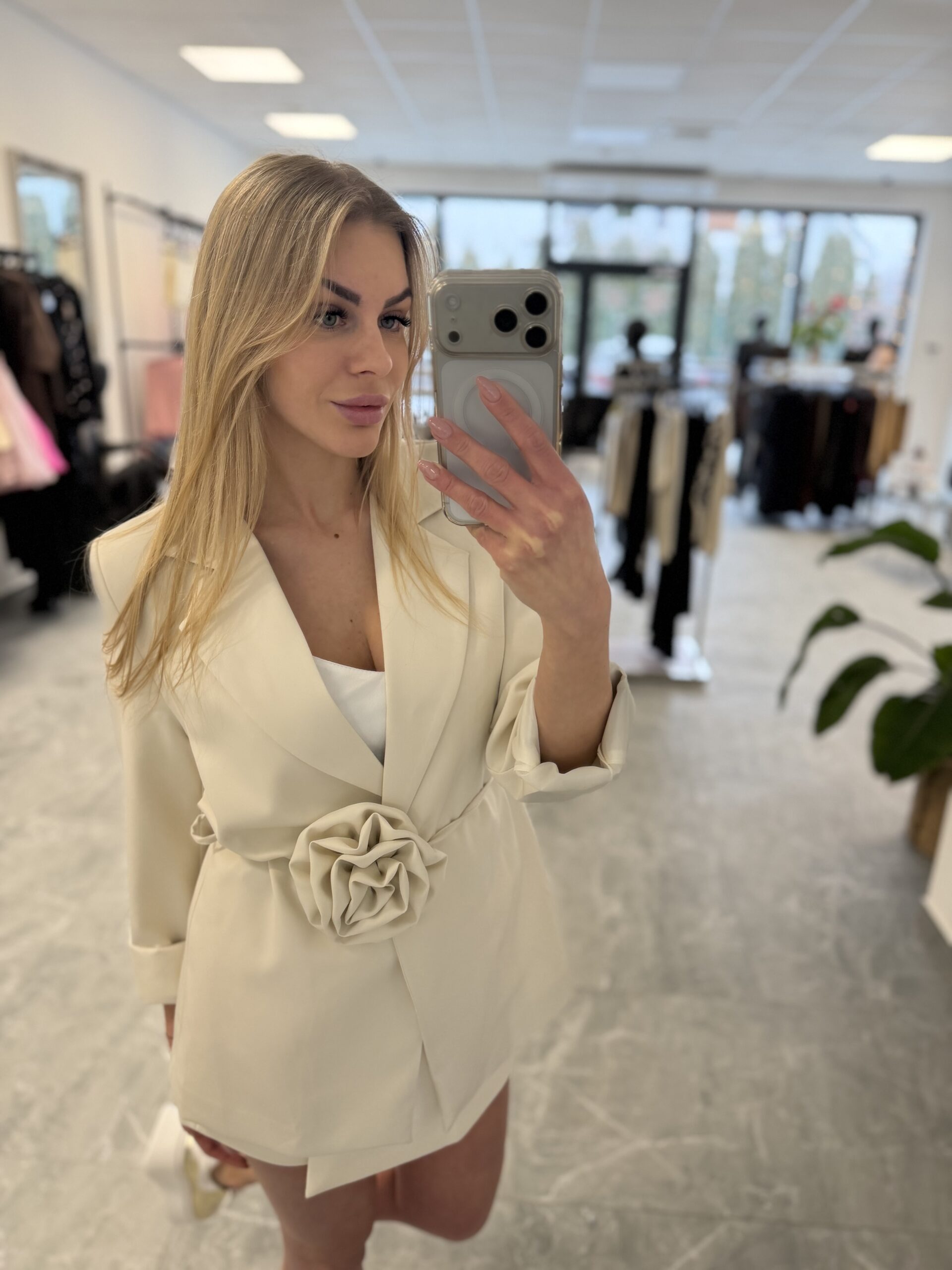 Piękna marynarka klasyczna, której dodatkowym atutem jest ozdobna róża, jednak znajduje się ona na sznureczku który można sobie przewiązać dzięki czemu jeśli mamy ochotę to możemy ubrać do marynarki dowolny pasek bez róży.