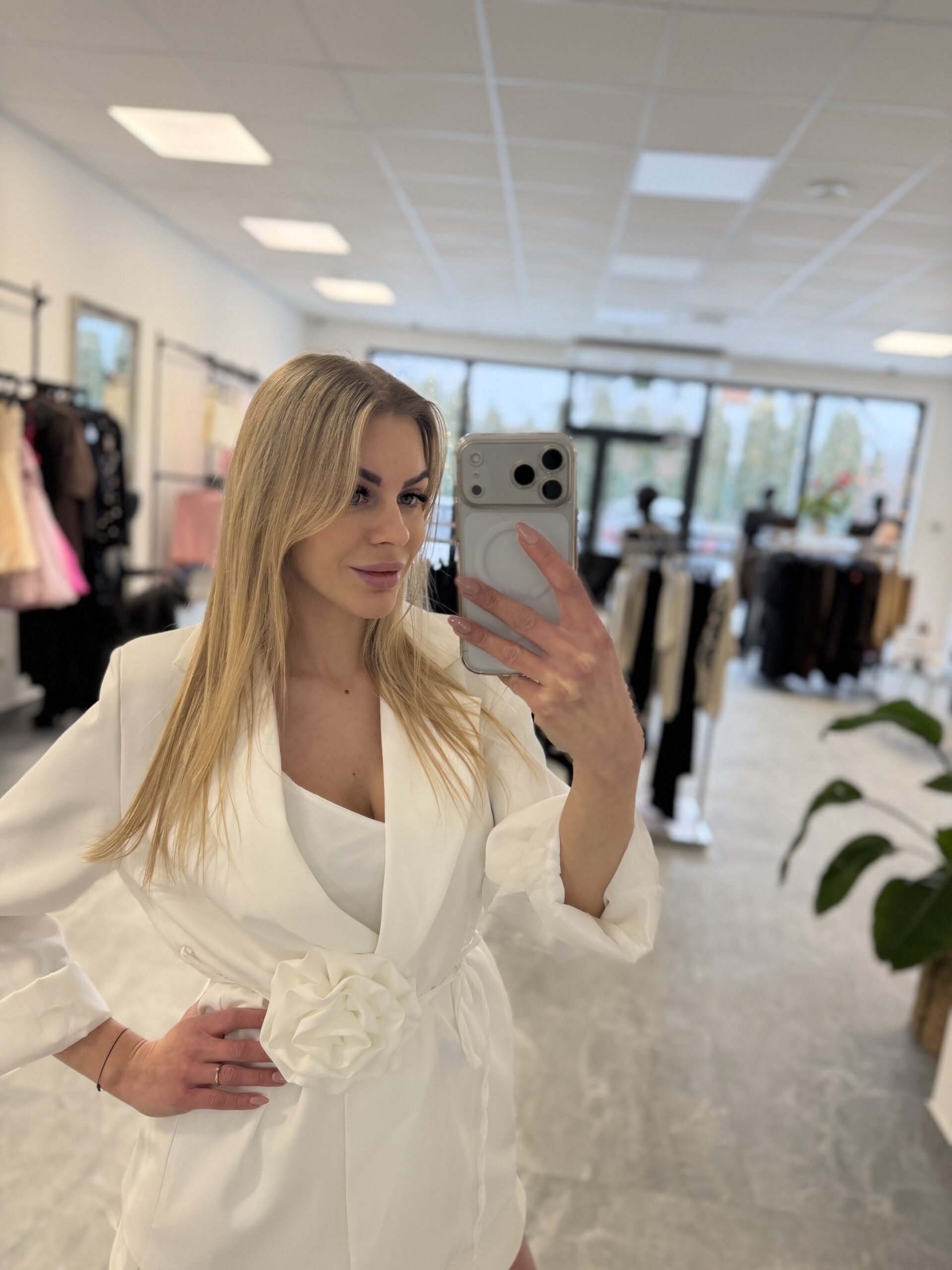 Piękna marynarka klasyczna, której dodatkowym atutem jest ozdobna róża, jednak znajduje się ona na sznureczku który można sobie przewiązać dzięki czemu jeśli mamy ochotę to możemy ubrać do marynarki dowolny pasek bez róży.