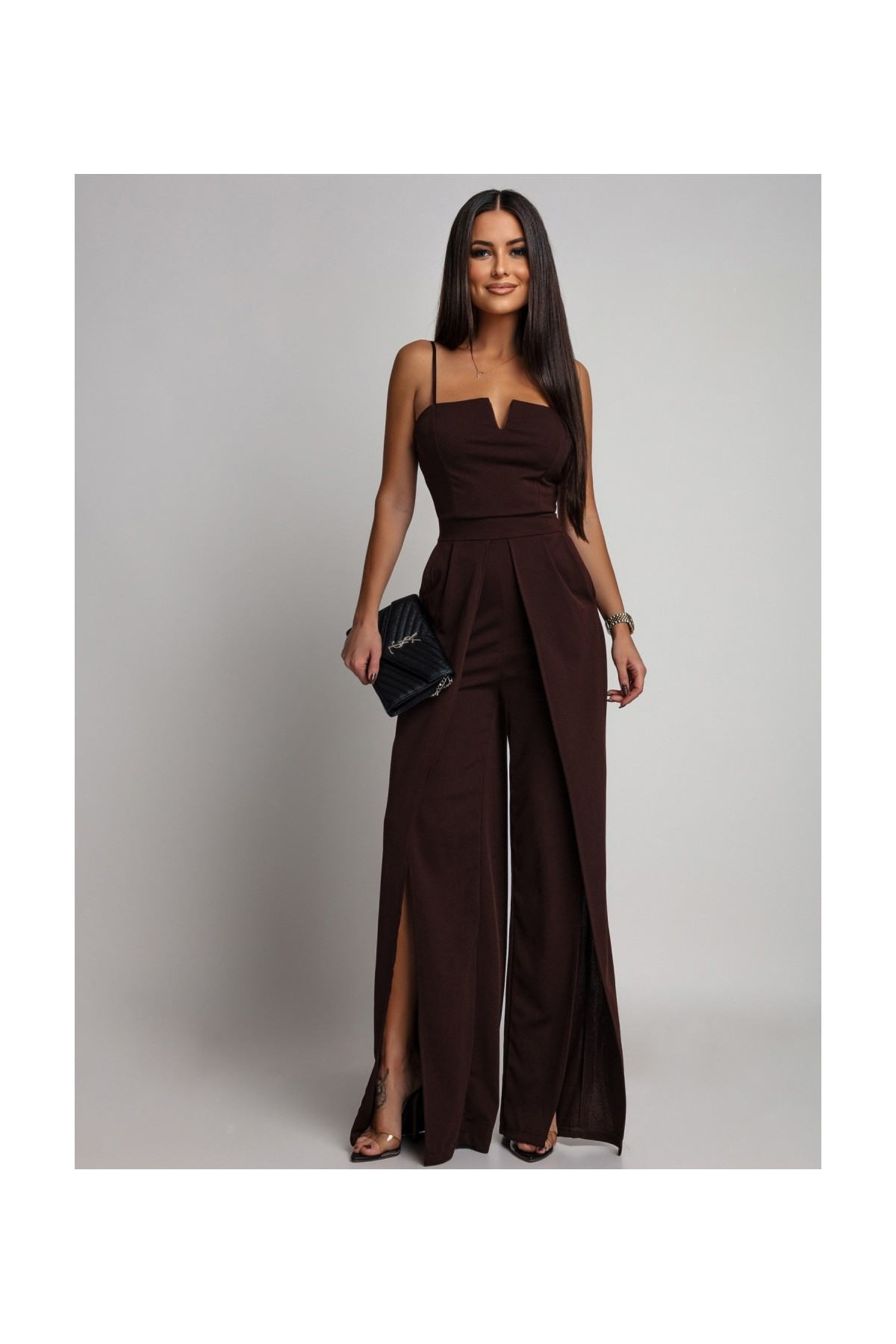 Kombinezon o długim fasonie, z długą i szeroką nogawką. Idealna propozycja na różne okazje. Jego dodatkowym atutem są rozcinane nogawki z przodu co dodaje kobiecości i lekkości.