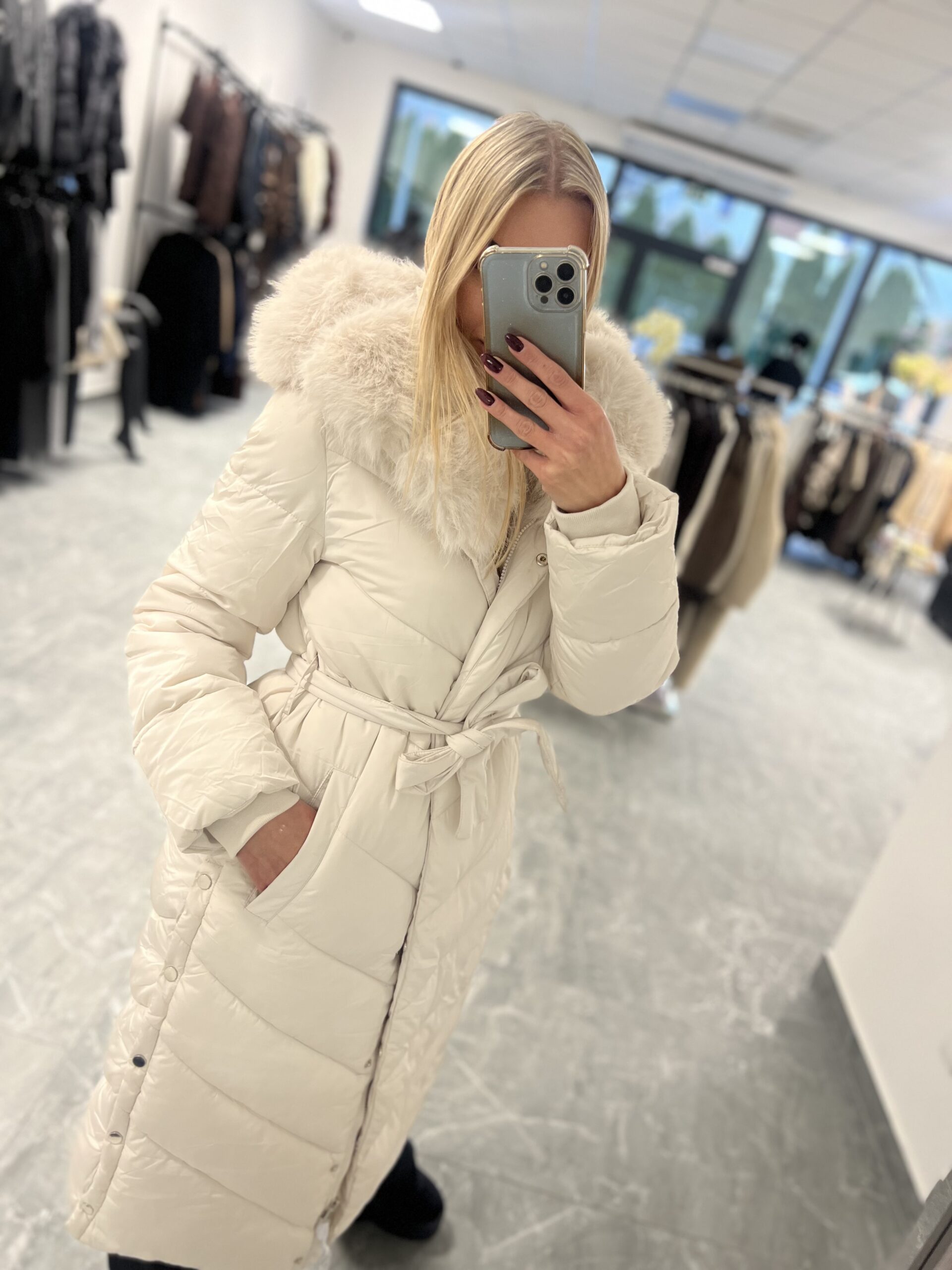 Długa kurtka z pikowaniem, ocieplana puchem syntetycznym. To model z kapturem, zapinany jest na suwak oraz napy. Posiada kieszenie z przodu, a długie rękawy wykończone są dzianinowymi ściągaczami.