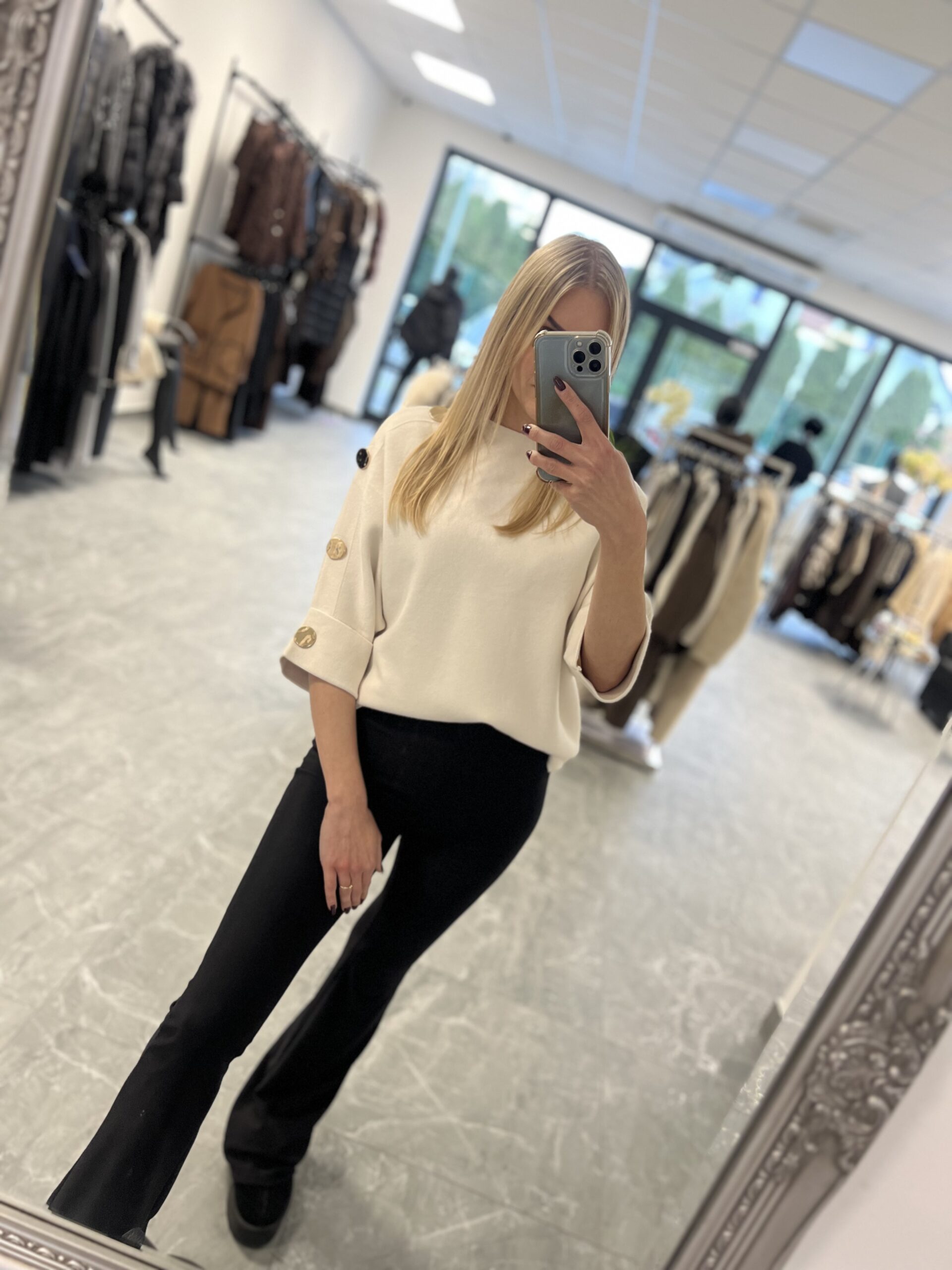 Świetny sweterek z 3/4 rękawem i ozdobnymi guzikami. Jego miły materiał sprawi, że będzie to Twoja ulubiona pozycja w szafie. \